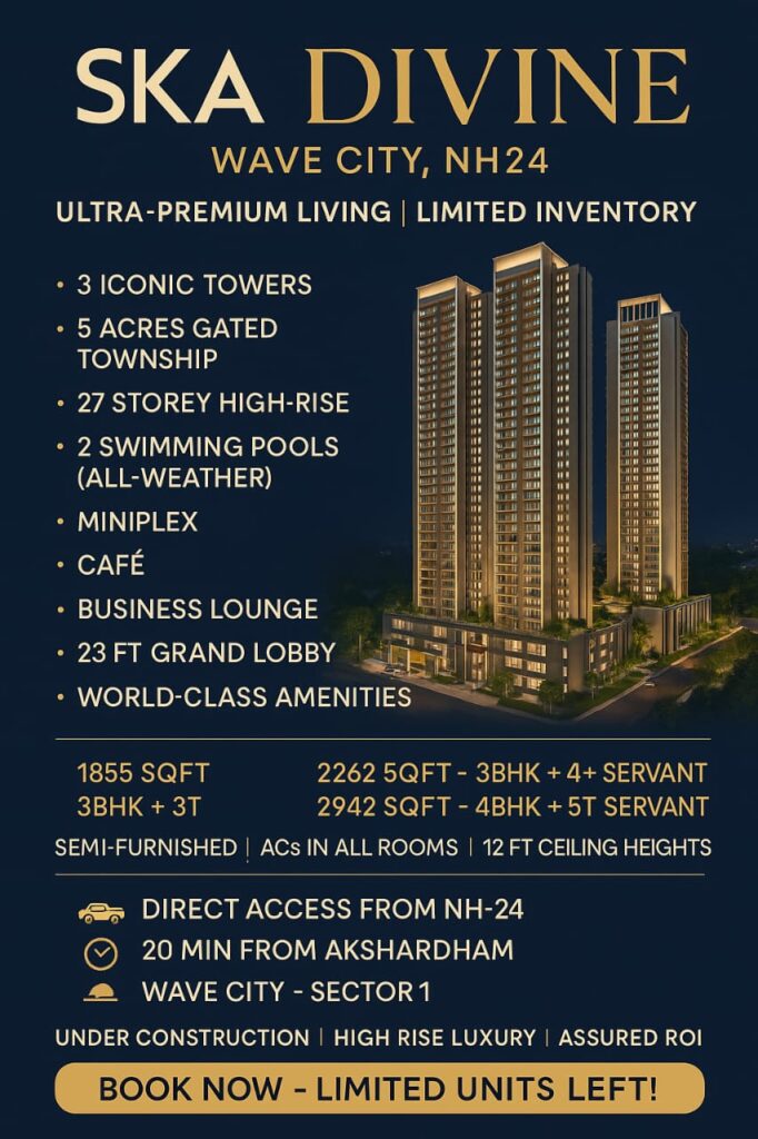 SKA Divine is a harmonious blend of luxury and serenity, nestled amidst expansive lush greenery. Spanning across a vast landscape, this prestigious development offers an array of spacious 3, 3+ BHK & 4+ BHK luxury apartments, thoughtfully designed to cater to the needs of discerning modern families. With world-class amenities and impeccable connectivity to every key destination across Delhi NCR. SKA Divine promises an elevated lifestyle, where elegance, convenience, and comfort converge in one of the region’s most coveted addresses.